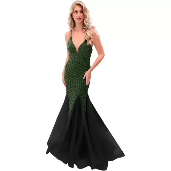 Mermaid Sequin Prom Dresses Tulle Fish’s Tail Formal Evening Gown V Neck Sparkly Dress(Navy-black)