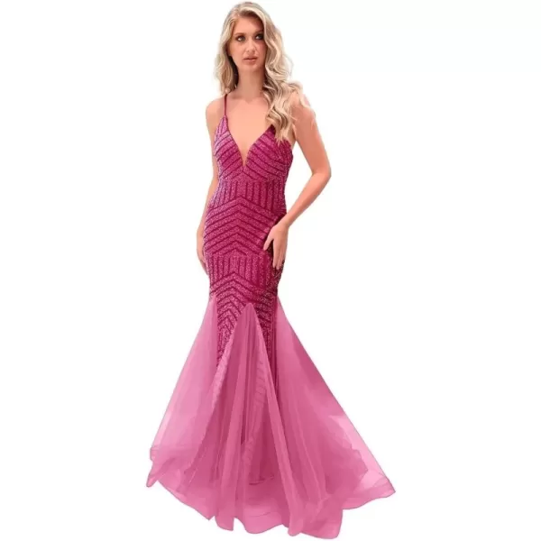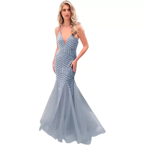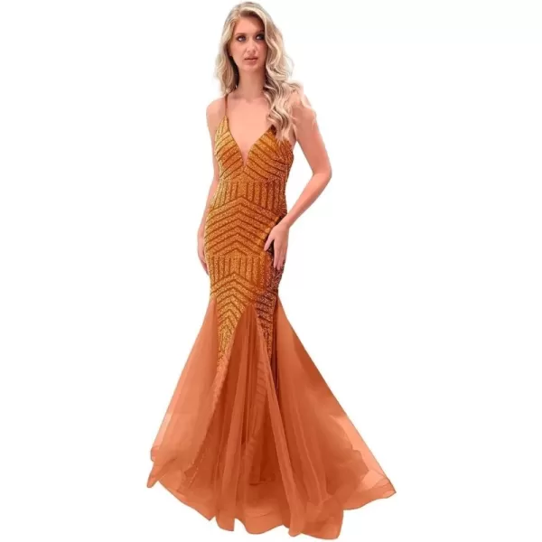 Mermaid Sequin Prom Dresses Tulle Fish’s Tail Formal Evening Gown V Neck Sparkly Dress(Brown)