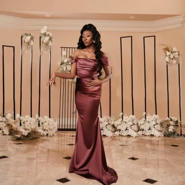 Be the first to review “Off Shoulder Bridesmaid Dresses Ruhced Mermaid Formal Gown for Wedding Bodycon Satin Prom Dress(Wine Red)”