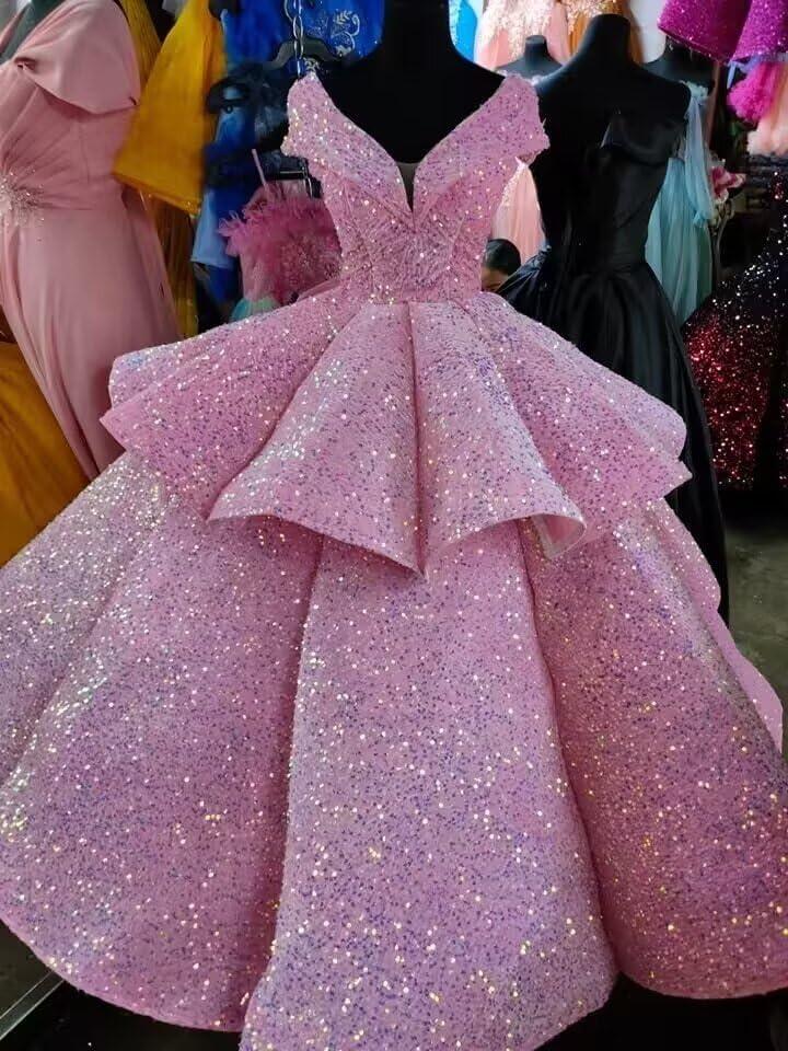 imageOff Shoulder Layered Sequin Flower Girl Dresses Sparkly Pageant Dress Girls Ball Gown Kids Prom Party CostumesYellow