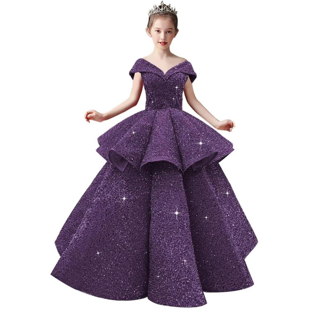Off Shoulder Layered Sequin Flower Girl Dresses Sparkly Pageant Dress Girls Ball Gown Kids Prom Party Costumes(Grape)