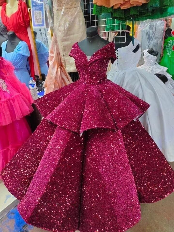 imageOff Shoulder Layered Sequin Flower Girl Dresses Sparkly Pageant Dress Girls Ball Gown Kids Prom Party CostumesRed