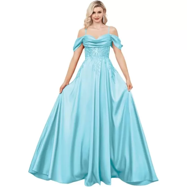 Off Shoulder Satin Bridesmaid Dresses for Wedding Spaghetti Straps Lace Applique Prom Dress Ruched Ball Gown(Aqua)