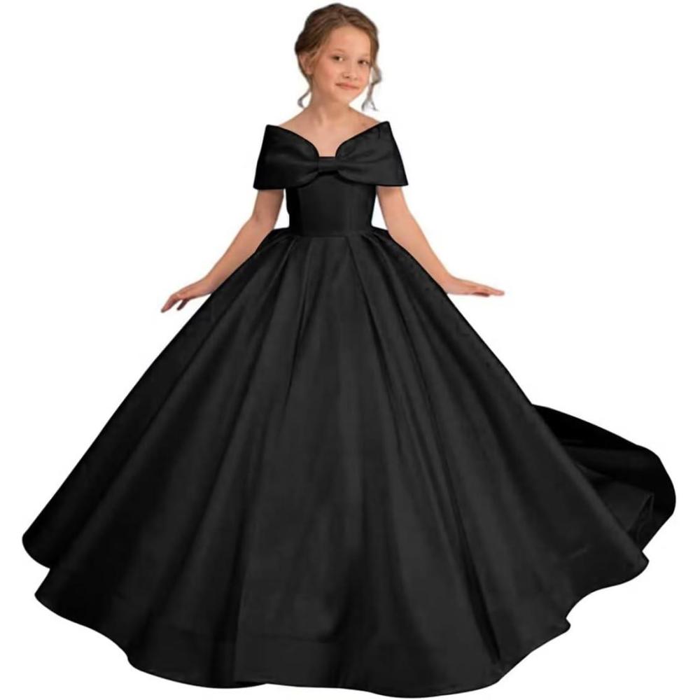 Off Shoulder Satin Flower Girls Dresses for Wedding A-Line Princess Ball Gown Pageant Dress for Girl Kids Dress(Black)