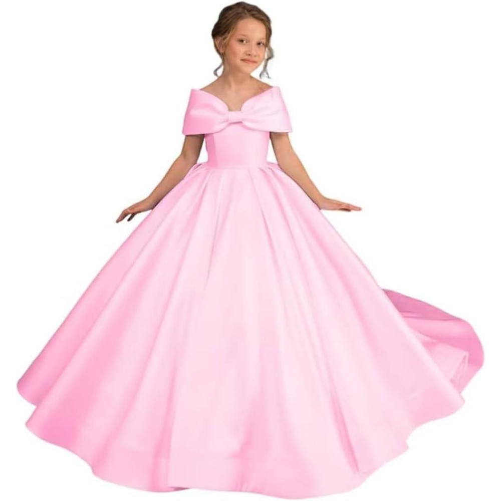 Off Shoulder Satin Flower Girls Dresses for Wedding A-Line Princess Ball Gown Pageant Dress for Girl Kids Dress(Pink)