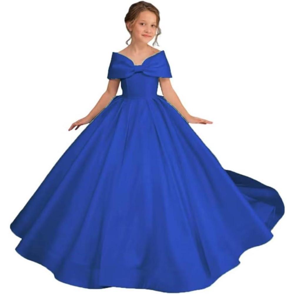 Off Shoulder Satin Flower Girls Dresses for Wedding A-Line Princess Ball Gown Pageant Dress for Girl Kids Dress(Royal Blue)