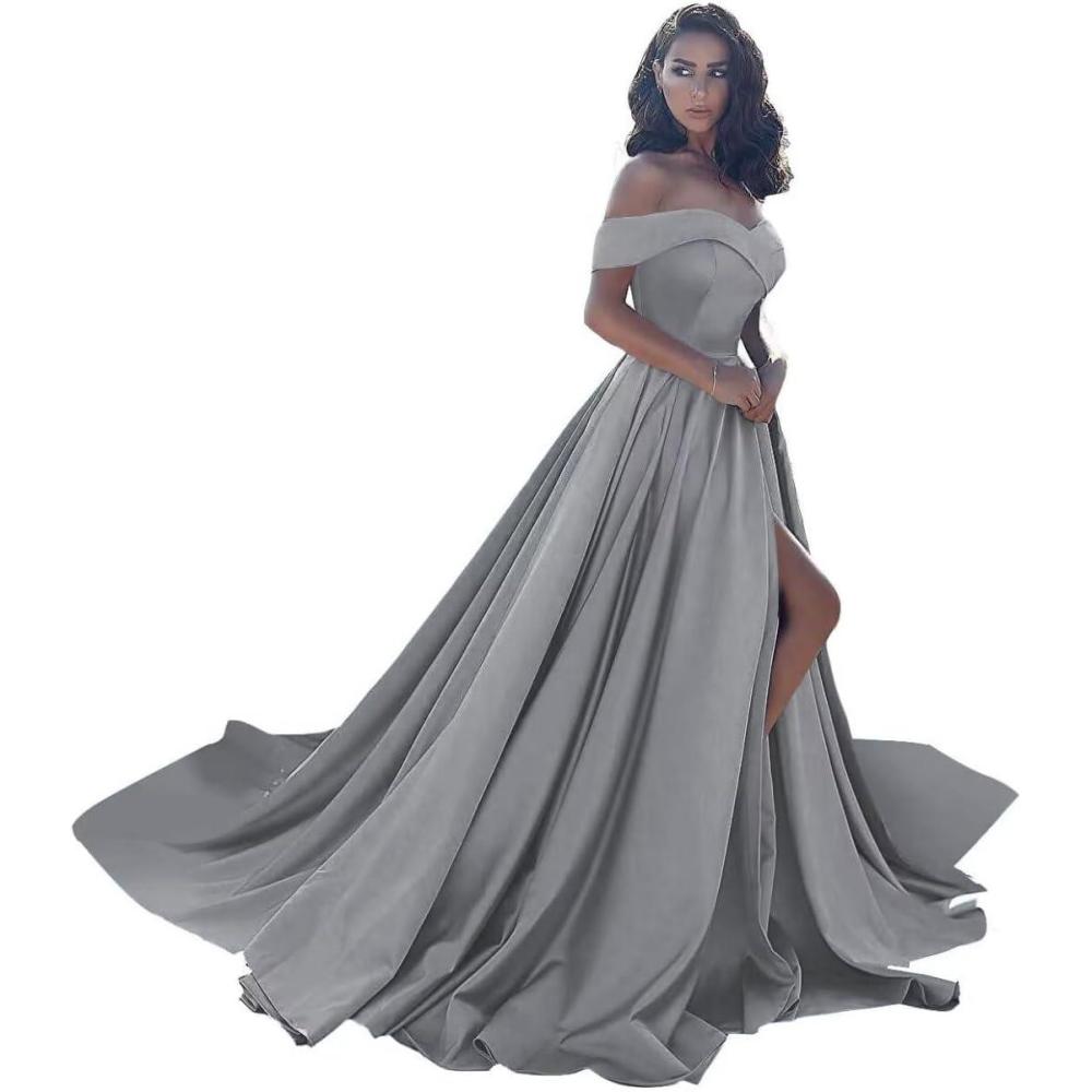 Off Shoulder Satin Prom Dresses Ball Gown Plus Size Formal Dresses for Women Wedding Dress with Slit(Dark Grey)