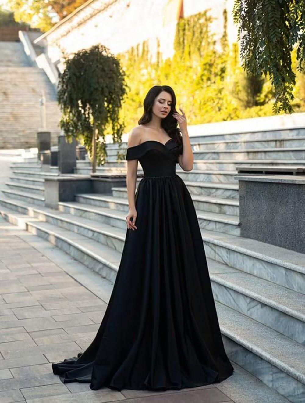 imageOff Shoulder Satin Prom Dresses Ball Gown Plus Size Formal Dresses for Women Wedding Dress with SlitViolet
