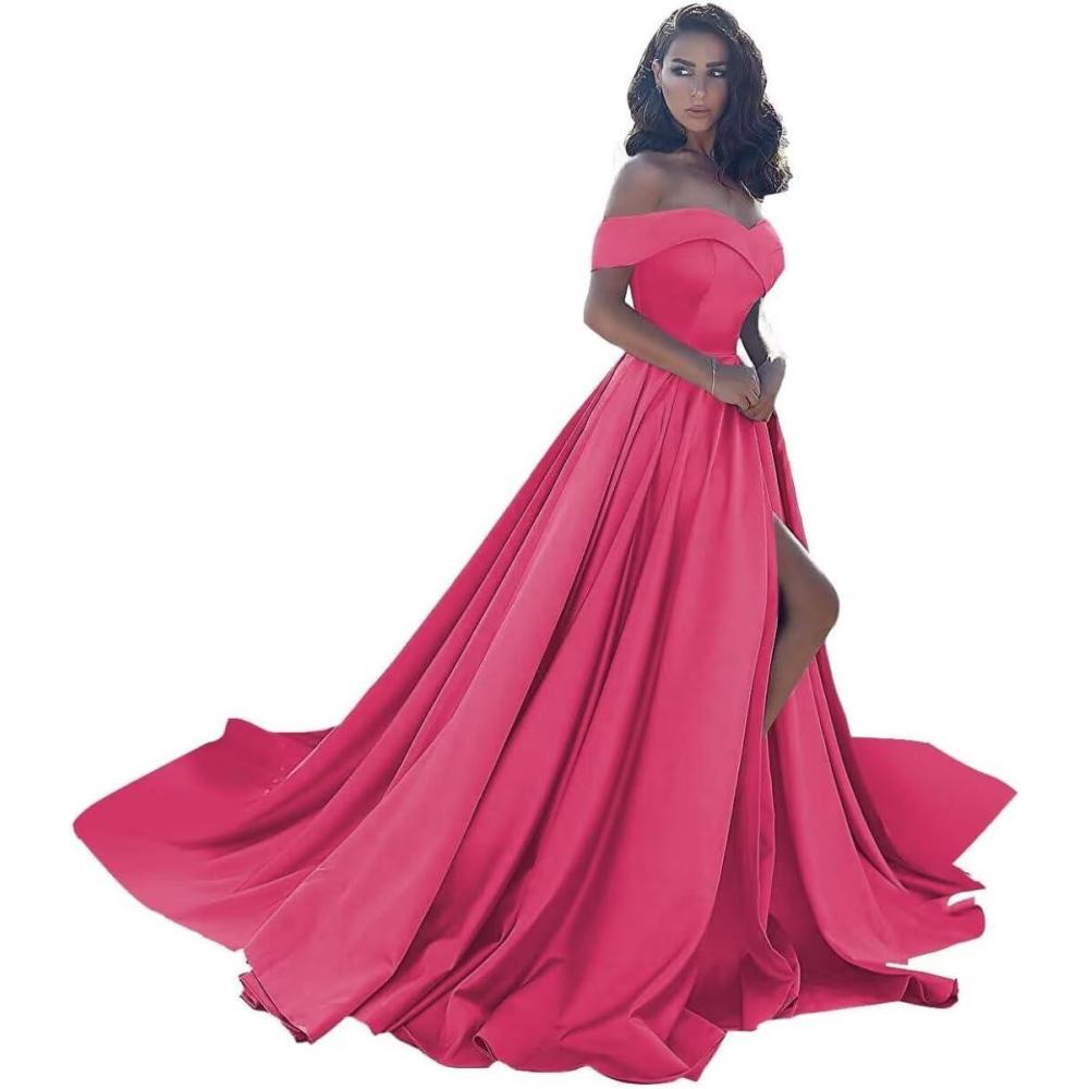 Off Shoulder Satin Prom Dresses Ball Gown Plus Size Formal Dresses for Women Wedding Dress with Slit(Hot Pink)