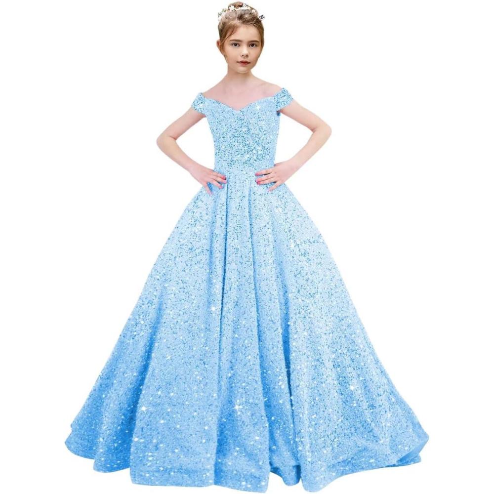 Off Shoulder Sequin Flower Girl Dresses for Wedding Sparkly Pageant Dresses Ball Gown Princess Kids Toddler Dress(Sky Blue)