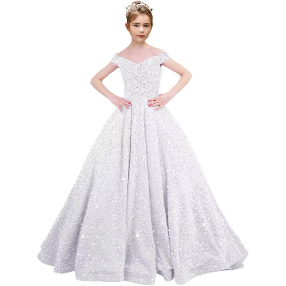 Off Shoulder Sequin Flower Girl Dresses for Wedding Sparkly Pageant Dresses Ball Gown Princess Kids Toddler Dress(White)