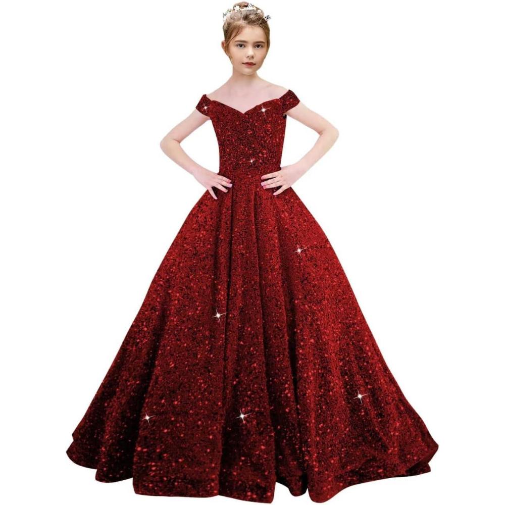 Get the Off Shoulder Sequin Flower Girl Dresses for Wedding Sparkly Pageant Dresses Ball Gown Princess Kids Toddler Dress(Wine Red) you want at a discounted price during our markdown sale event.