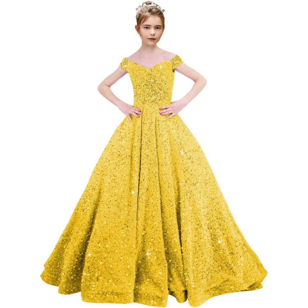 Off Shoulder Sequin Flower Girl Dresses for Wedding Sparkly Pageant Dresses Ball Gown Princess Kids Toddler Dress(Yellow)