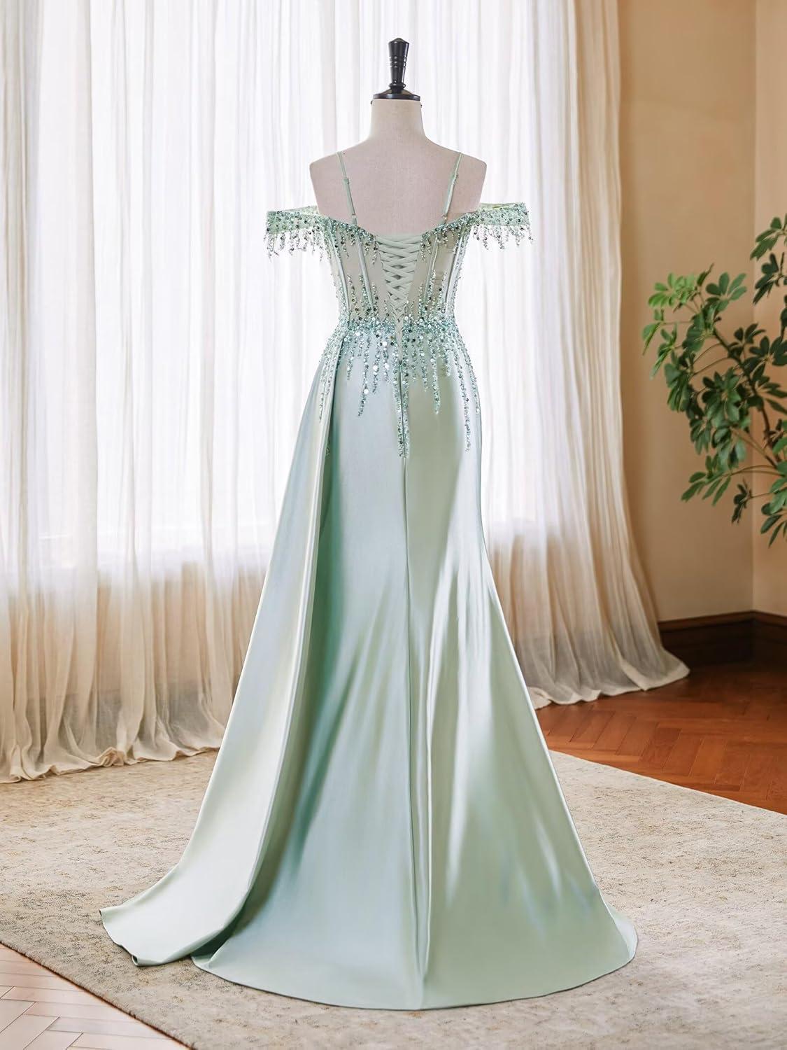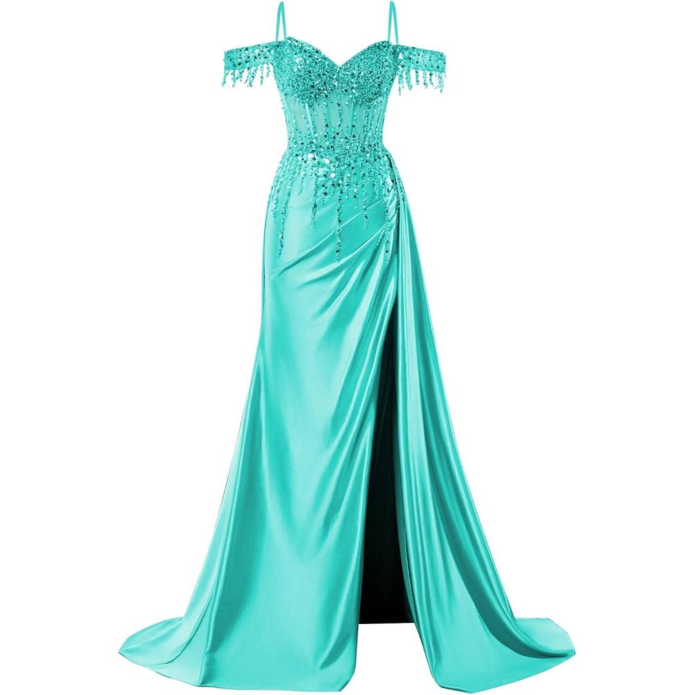 Welcome to our store: Off Shoulder Sequin Prom Dresses Long 2025 Satin Mermaid Formal Dresses Spaghetti Strap Evening Party Dress with Slit