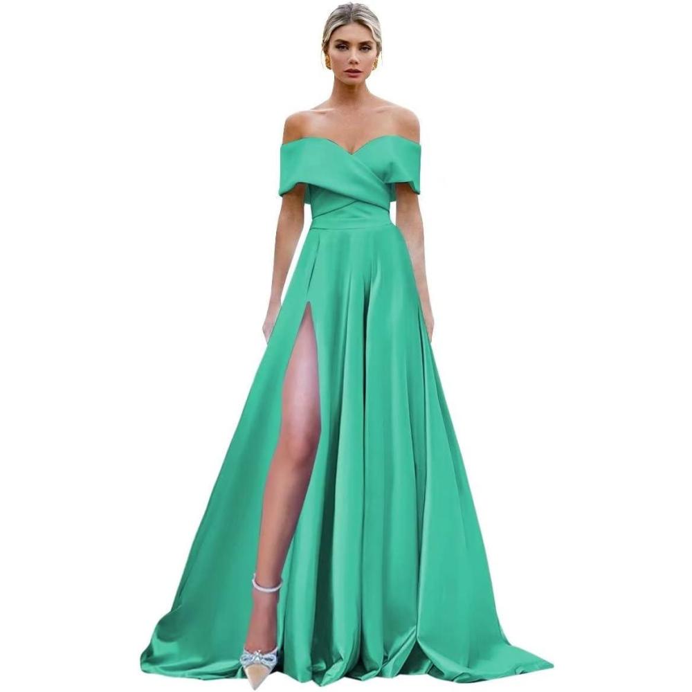 Be the first to review “Off Shoulder Split Prom Dresses Long Satin Ball Gown Floor Length Formal Dress Evening Gowns Simple Wedding Dress for Women(Turquoise)”