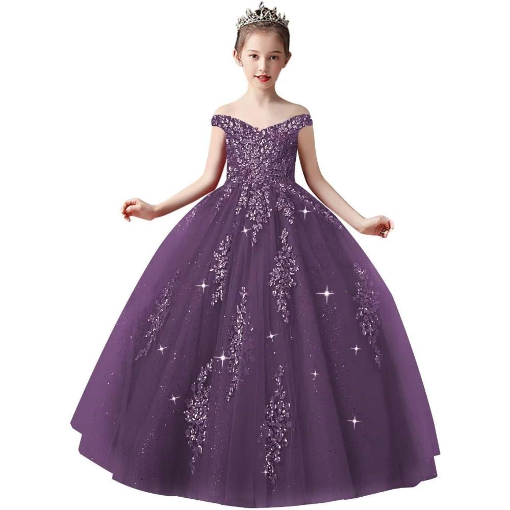 Off Shoulder Tulle Pageant Dress Lace Applique Flower Girl Dress Ball Gown Toddler Kids Birthday Party Dress(Purple)