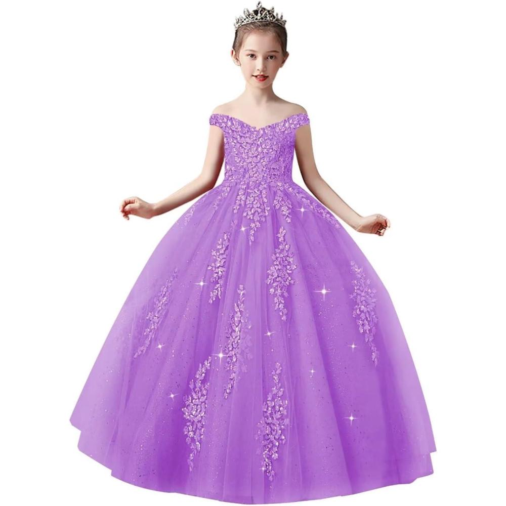 Off Shoulder Tulle Pageant Dress Lace Applique Flower Girl Dress Ball Gown Toddler Kids Birthday Party Dress(Lilac)
