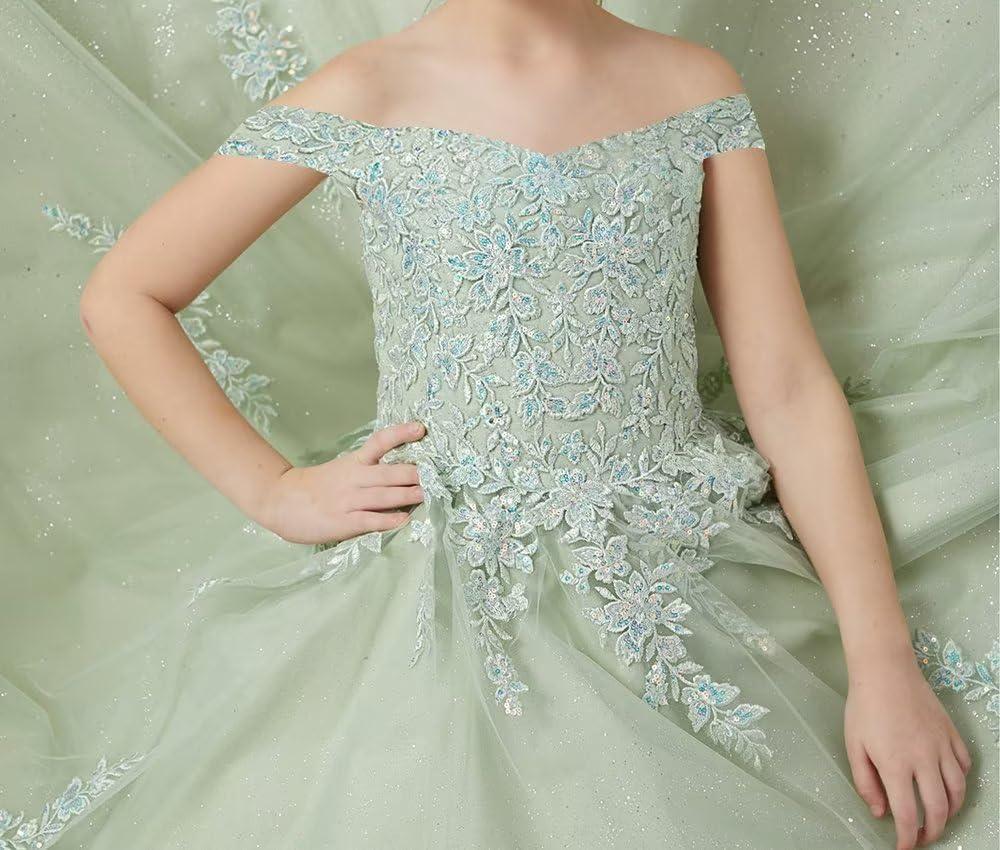 Off Shoulder Tulle Pageant Dress Lace Applique Flower Girl Dress Ball Gown Toddler Kids Birthday Party Dress(Olive)