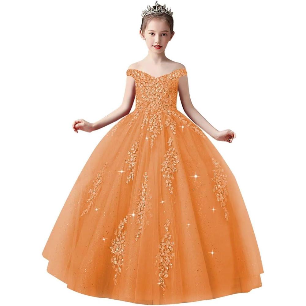 Get up to 70% off on Off Shoulder Tulle Pageant Dress Lace Applique Flower Girl Dress Ball Gown Toddler Kids Birthday Party Dress(Orange) styles during our end-of-season clearance event.