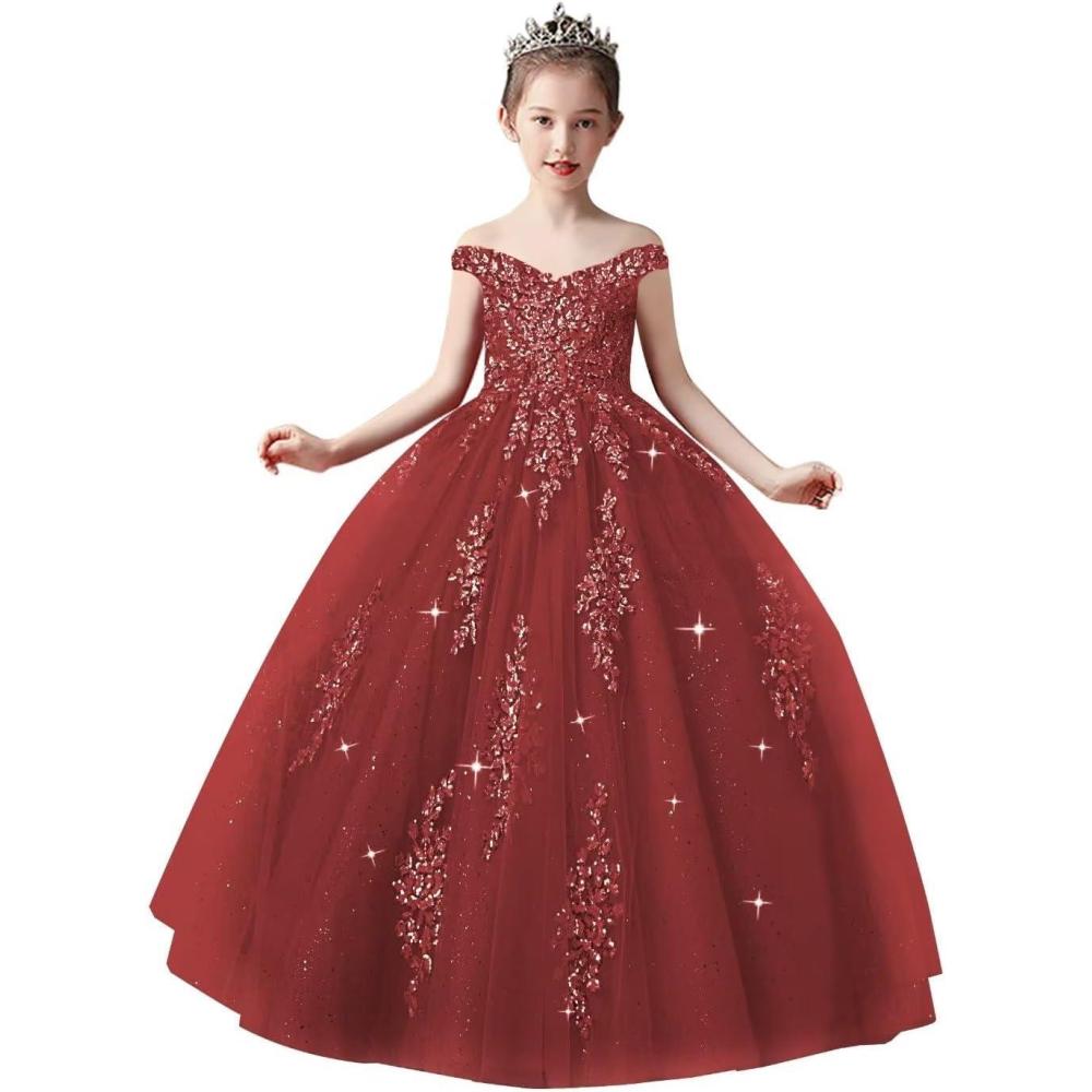 Off Shoulder Tulle Pageant Dress Lace Applique Flower Girl Dress Ball Gown Toddler Kids Birthday Party Dress(Wine Red)