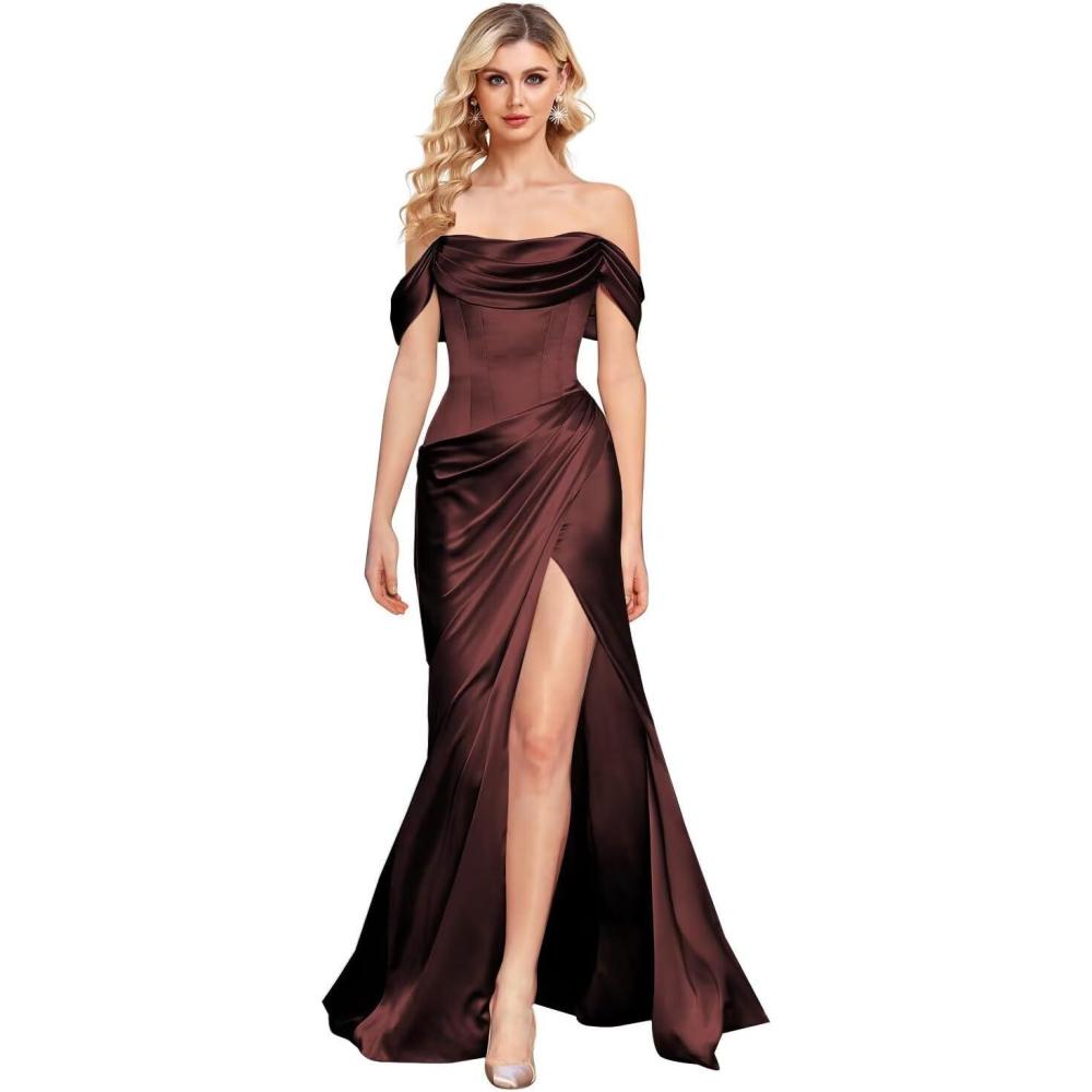 imageOff The Shoulder Mermaid Prom Dresses for Women Satin Silk Ruched Wrap Formal Evening Gowns with SlitBurnt Orange