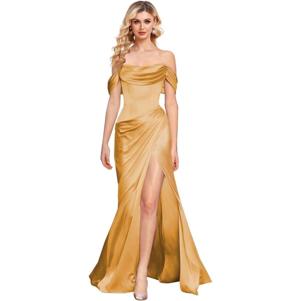 Off The Shoulder Mermaid Prom Dresses for Women Satin Silk Ruched Wrap Formal Evening Gowns with Slit(Gold)