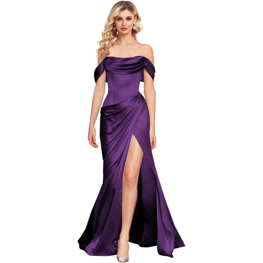 Our clearance section features the best deals on Off The Shoulder Mermaid Prom Dresses for Women Satin Silk Ruched Wrap Formal Evening Gowns with Slit(Grape) and accessories. Check it out now!