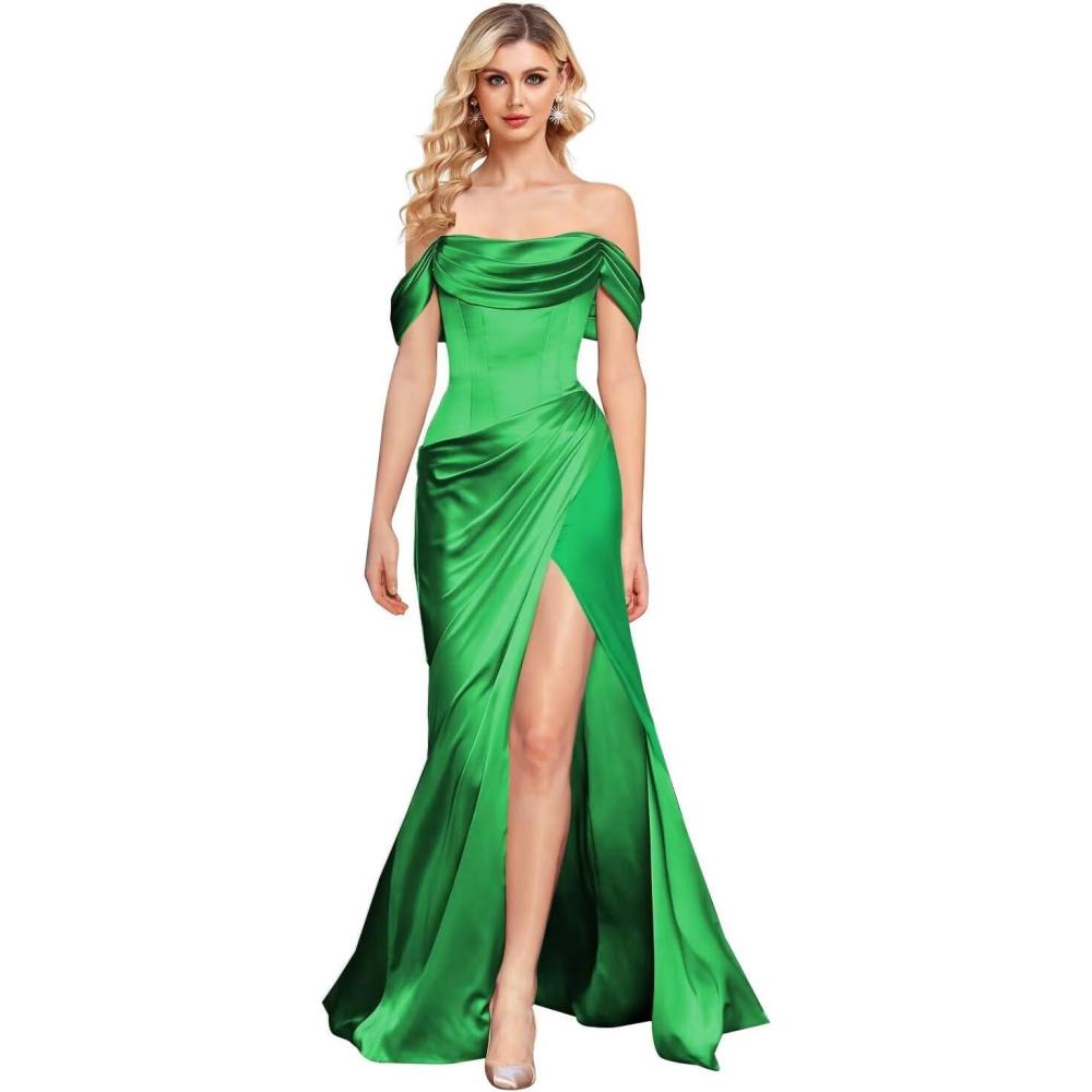 Off The Shoulder Mermaid Prom Dresses for Women Satin Silk Ruched Wrap Formal Evening Gowns with Slit(Green)