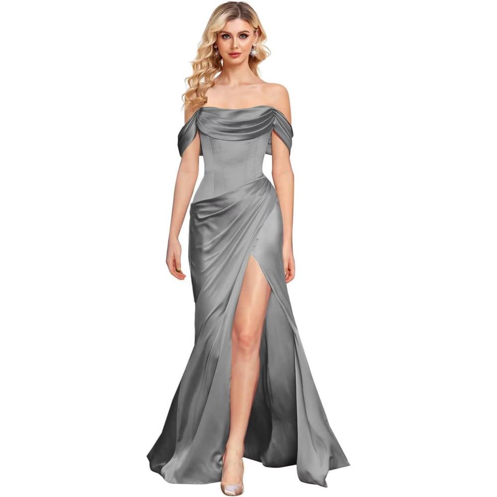 Off The Shoulder Mermaid Prom Dresses for Women Satin Silk Ruched Wrap Formal Evening Gowns with Slit(Grey)
