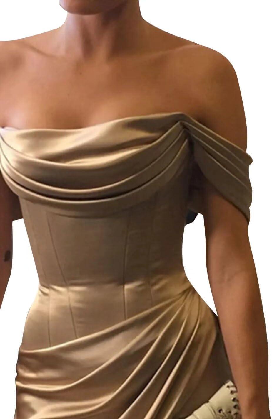 imageOff The Shoulder Mermaid Prom Dresses for Women Satin Silk Ruched Wrap Formal Evening Gowns with SlitBurnt Orange
