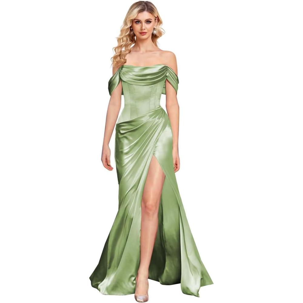Get up to 60% off on Off The Shoulder Mermaid Prom Dresses for Women Satin Silk Ruched Wrap Formal Evening Gowns with Slit(Sage) styles during our winter sale event.