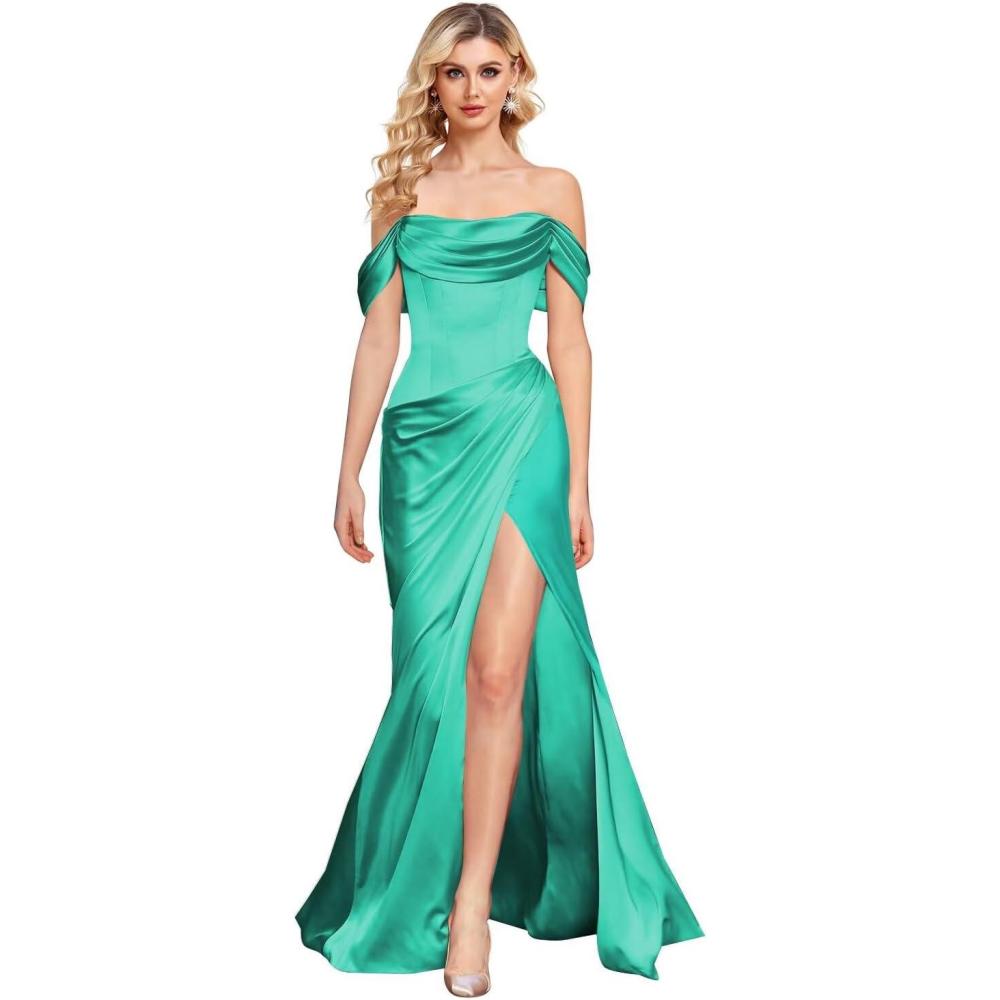 Off The Shoulder Mermaid Prom Dresses for Women Satin Silk Ruched Wrap Formal Evening Gowns with Slit(Turquoise)