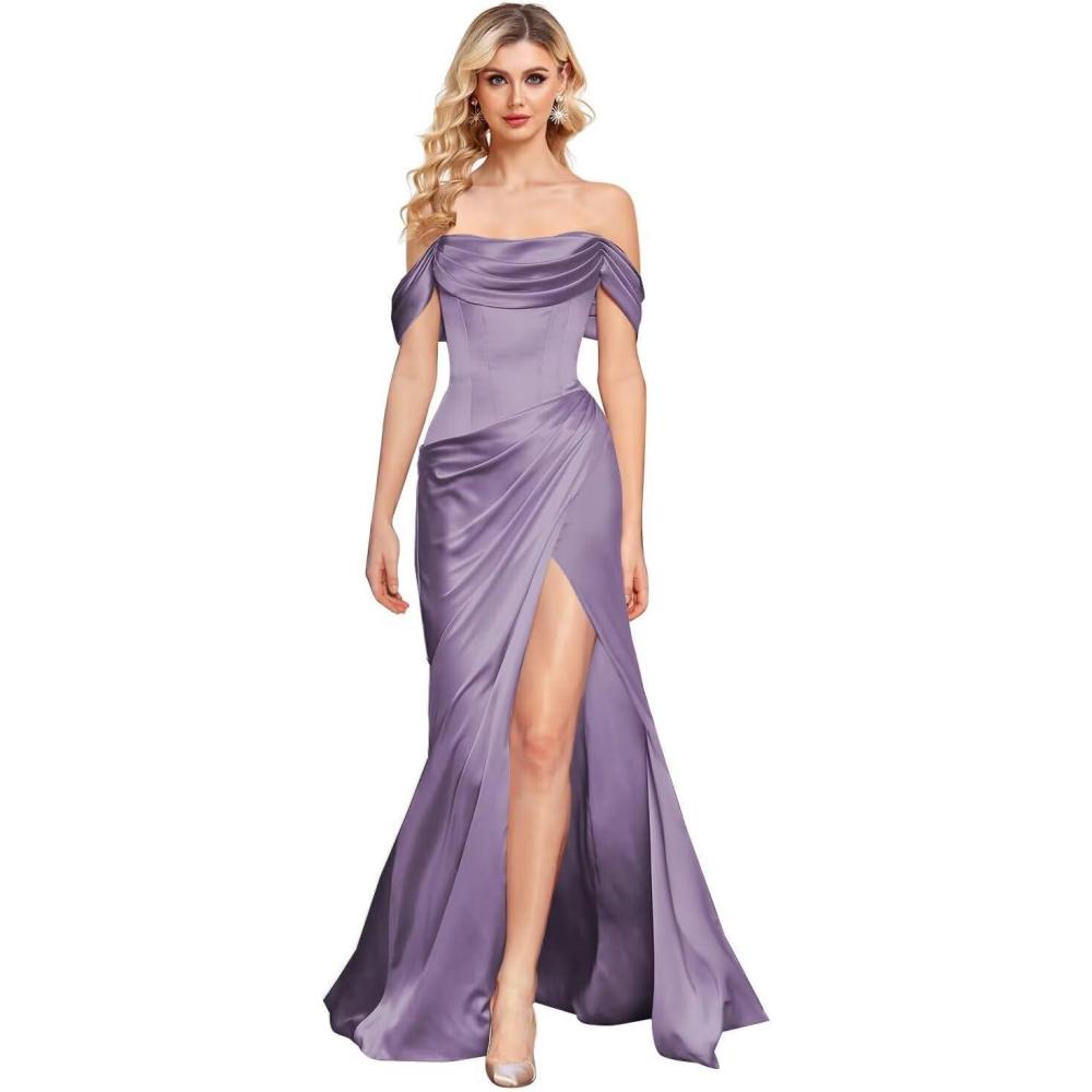 Off The Shoulder Mermaid Prom Dresses for Women Satin Silk Ruched Wrap Formal Evening Gowns with Slit(Wisteria)