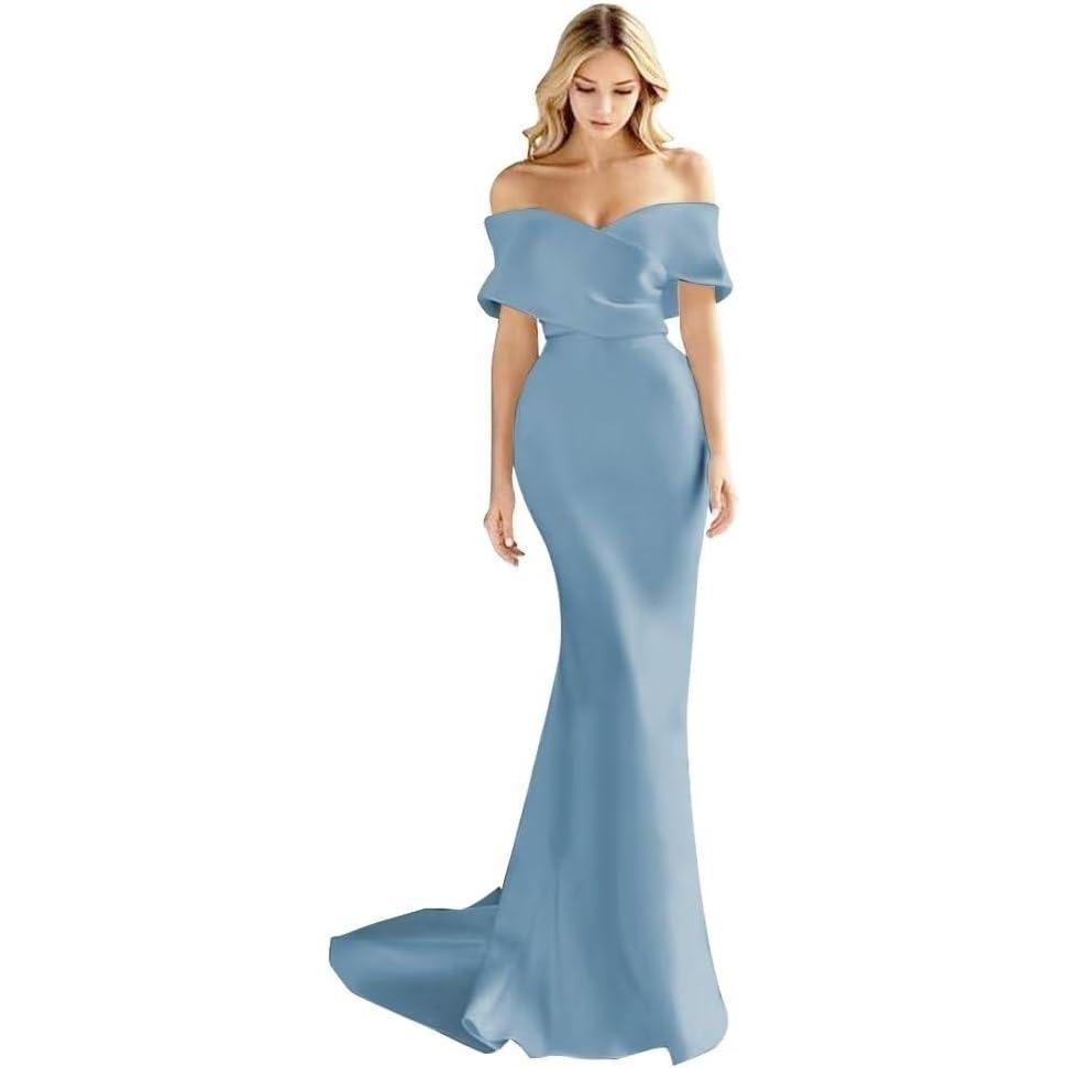 Off The Shoulder Mermaid Prom Dresses Long Satin Simple Wedding Dress Elegant Ruched Wrap Formal Evening Gowns for Women(Dusty Blue)