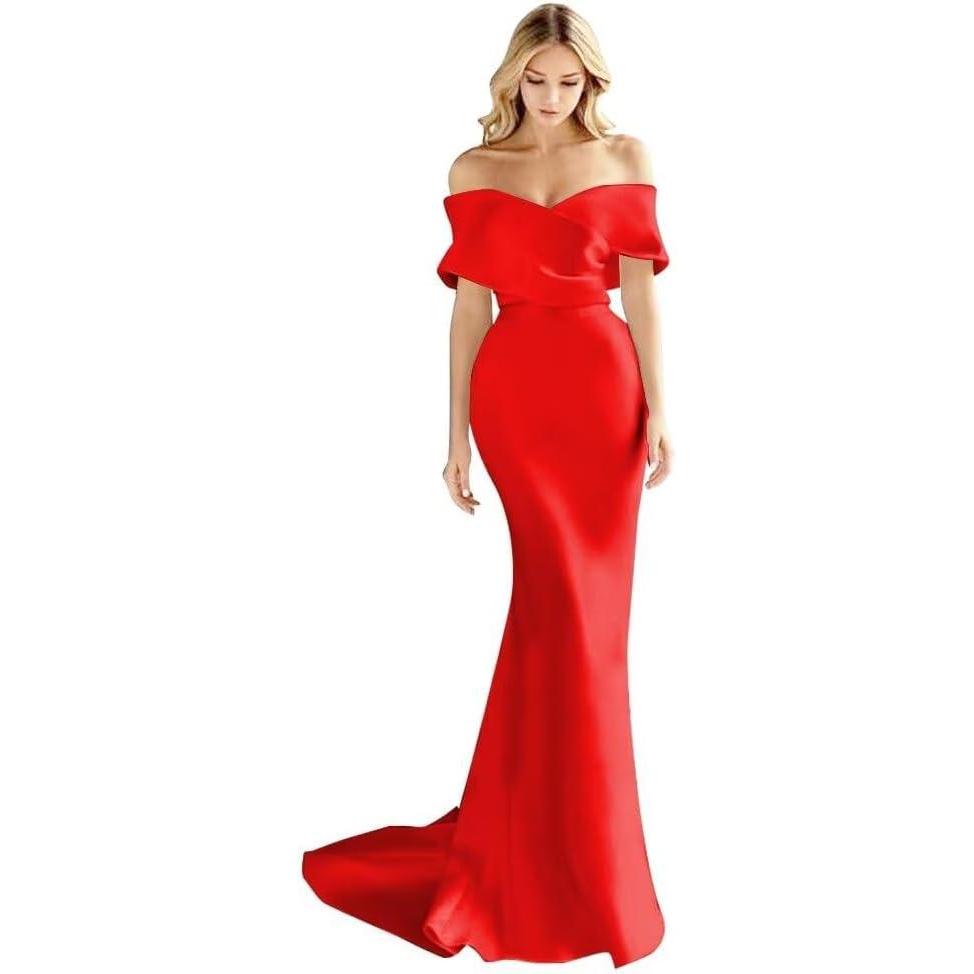 Off The Shoulder Mermaid Prom Dresses Long Satin Simple Wedding Dress Elegant Ruched Wrap Formal Evening Gowns for Women(Red)