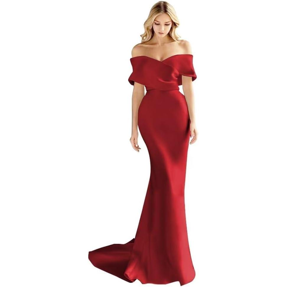 Off The Shoulder Mermaid Prom Dresses Long Satin Simple Wedding Dress Elegant Ruched Wrap Formal Evening Gowns for Women(Wine Red)