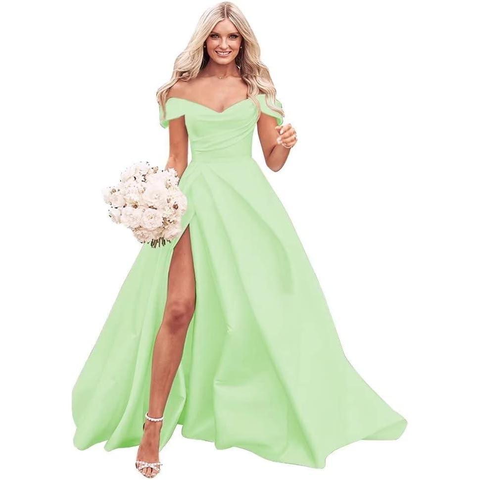 Off The Shoulder Satin Prom Dress for Women Long Ball Gown Wedding Dress Floor Length Formal Evening Gowns with Slit(Mint)