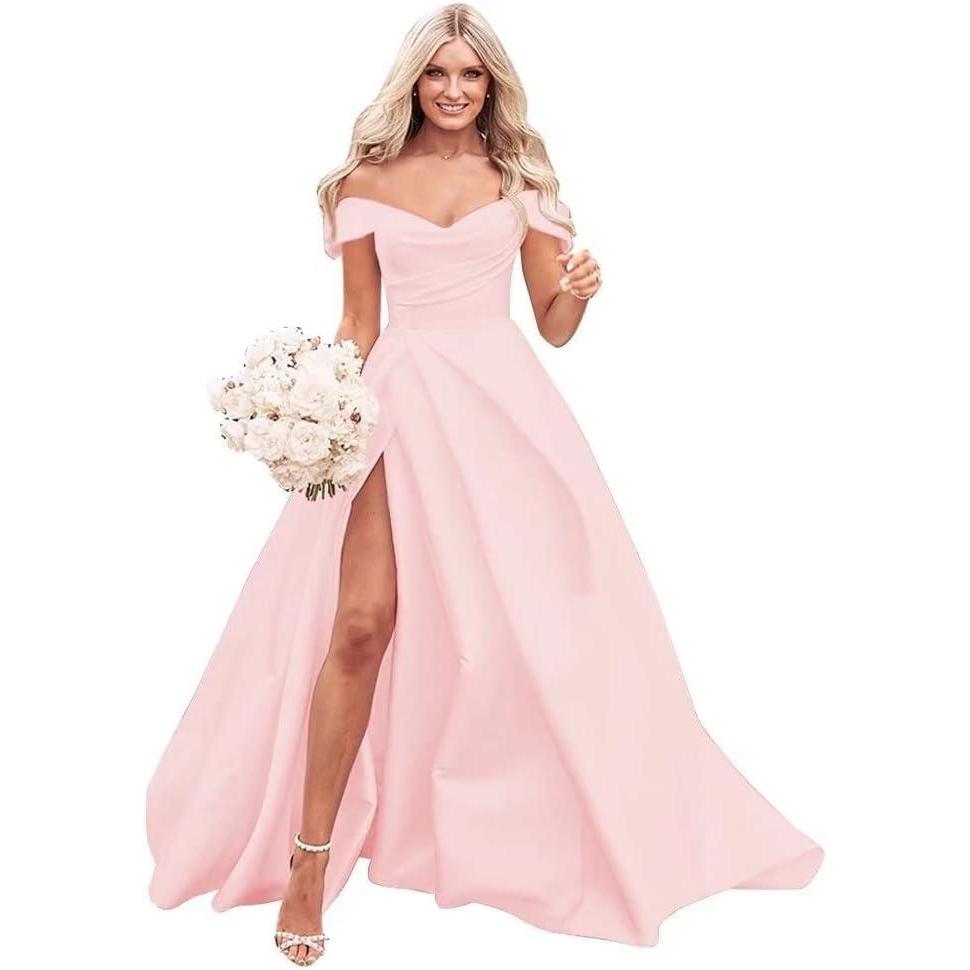 Off The Shoulder Satin Prom Dress for Women Long Ball Gown Wedding Dress Floor Length Formal Evening Gowns with Slit(Pink)