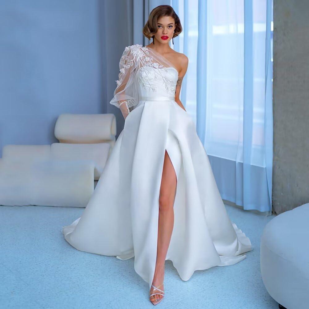 One Shoulder Lace Applique Prom Dresses Long Sleeve Wedding Dresses Tulle A Line Princess Ball Gown with Slit(Champagne)