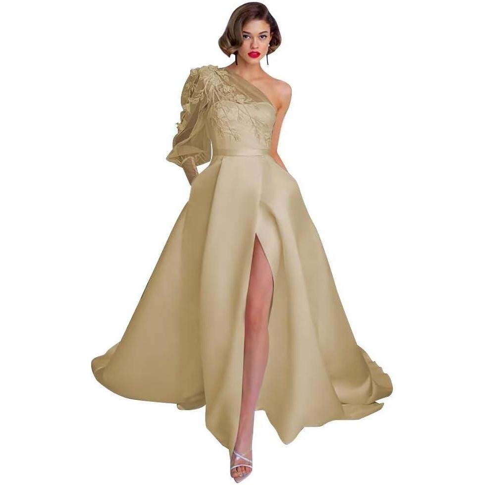 One Shoulder Lace Applique Prom Dresses Long Sleeve Wedding Dresses Tulle A Line Princess Ball Gown with Slit(Champagne)