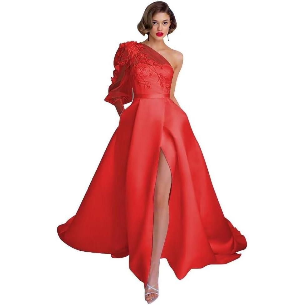 One Shoulder Lace Applique Prom Dresses Long Sleeve Wedding Dresses Tulle A Line Princess Ball Gown with Slit(Red)