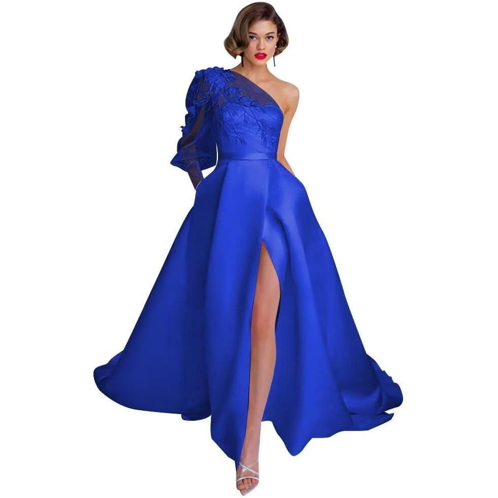 One Shoulder Lace Applique Prom Dresses Long Sleeve Wedding Dresses Tulle A Line Princess Ball Gown with Slit(Royal Blue)