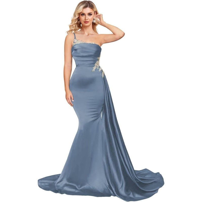 One Shoulder Mermaid Bridesmaid Dresses for Wedding Applique Prom Dress Spaghetti Straps Formal Evening Gowns(Dusty Blue)