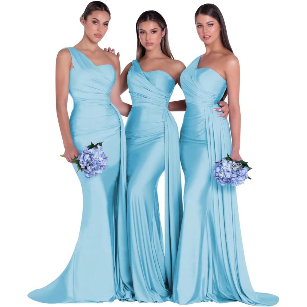 One Shoulder Mermaid Bridesmaid Dresses for Wedding Ruched Satin Prom Dress Bodycon Formal Party Dress(Baby Blue)