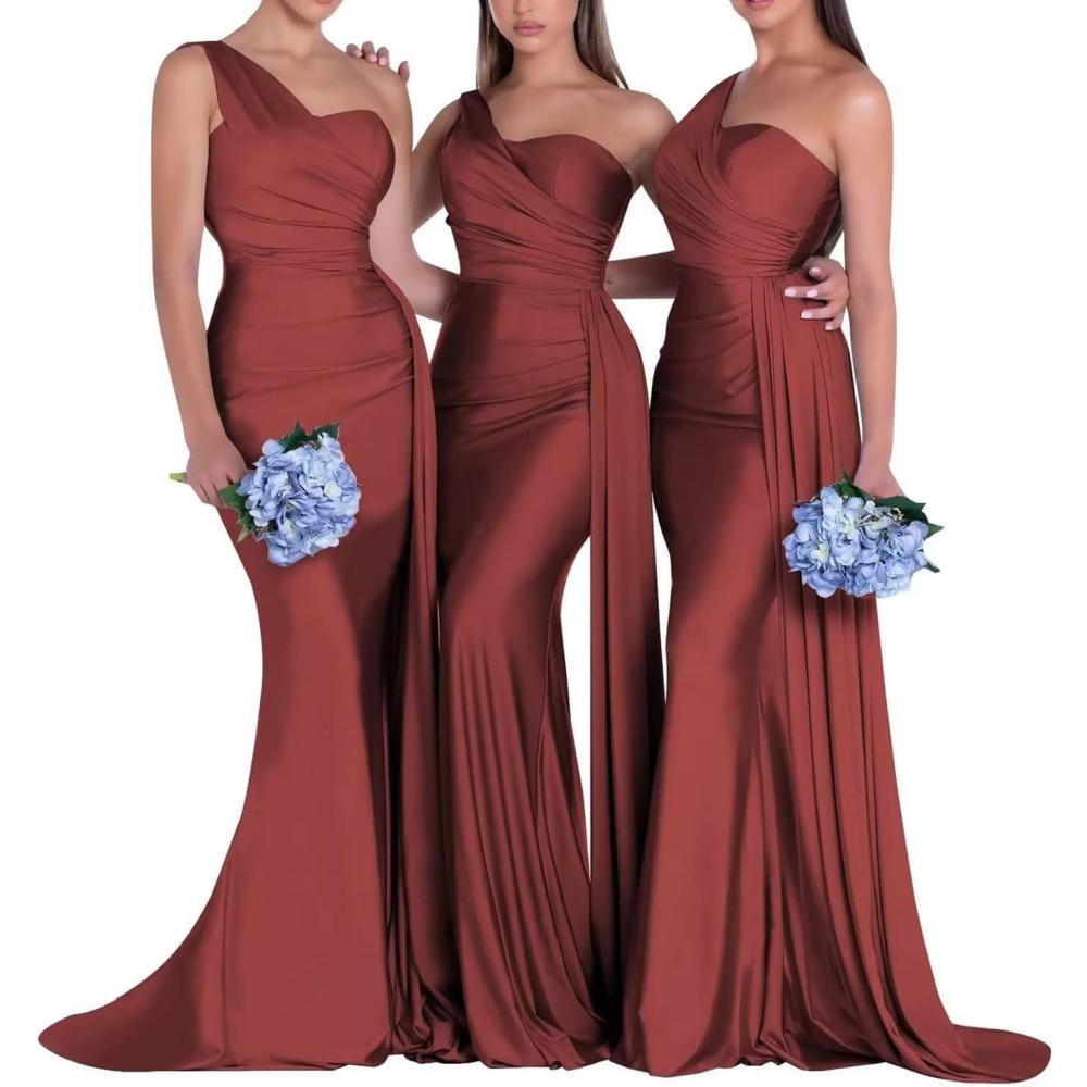 One Shoulder Mermaid Bridesmaid Dresses for Wedding Ruched Satin Prom Dress Bodycon Formal Party Dress(Burnt Orange)