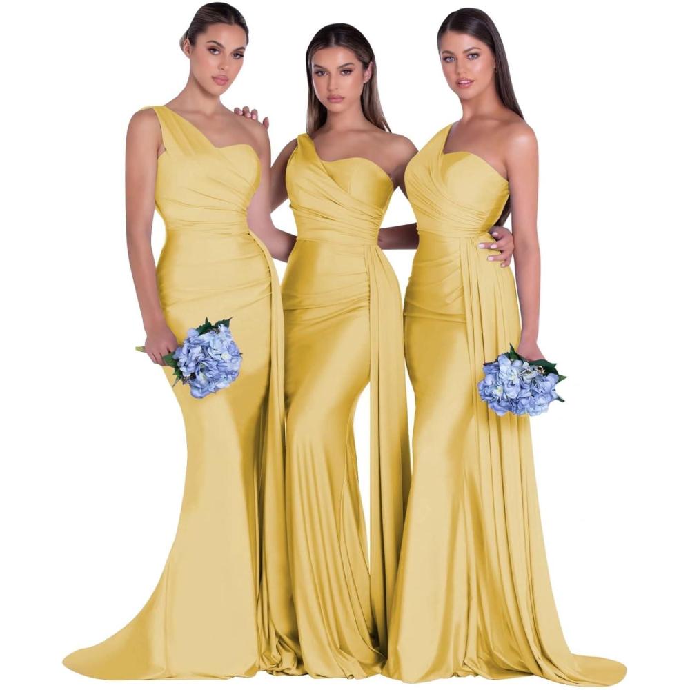 One Shoulder Mermaid Bridesmaid Dresses for Wedding Ruched Satin Prom Dress Bodycon Formal Party Dress(Gold)