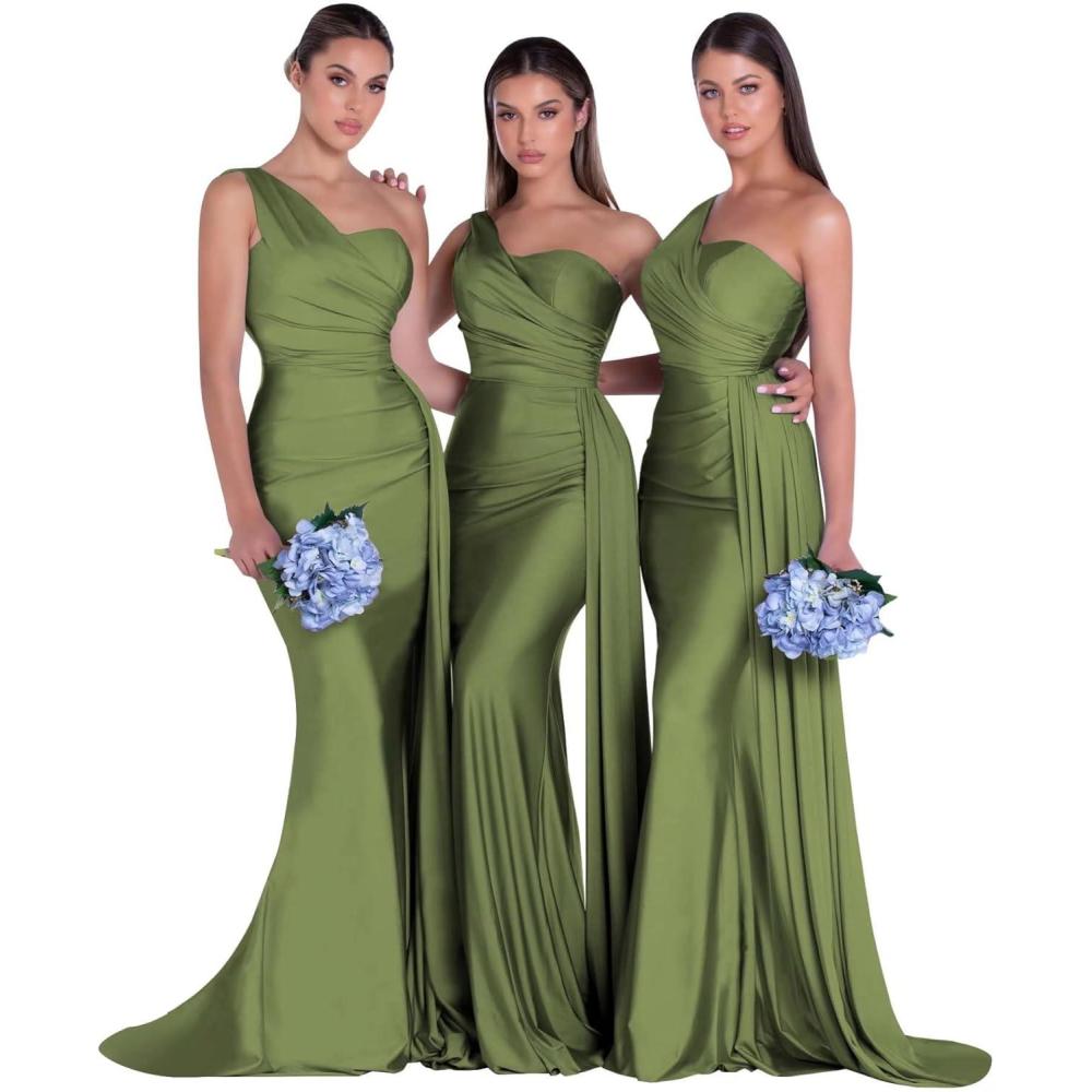 One Shoulder Mermaid Bridesmaid Dresses for Wedding Ruched Satin Prom Dress Bodycon Formal Party Dress(Olive)
