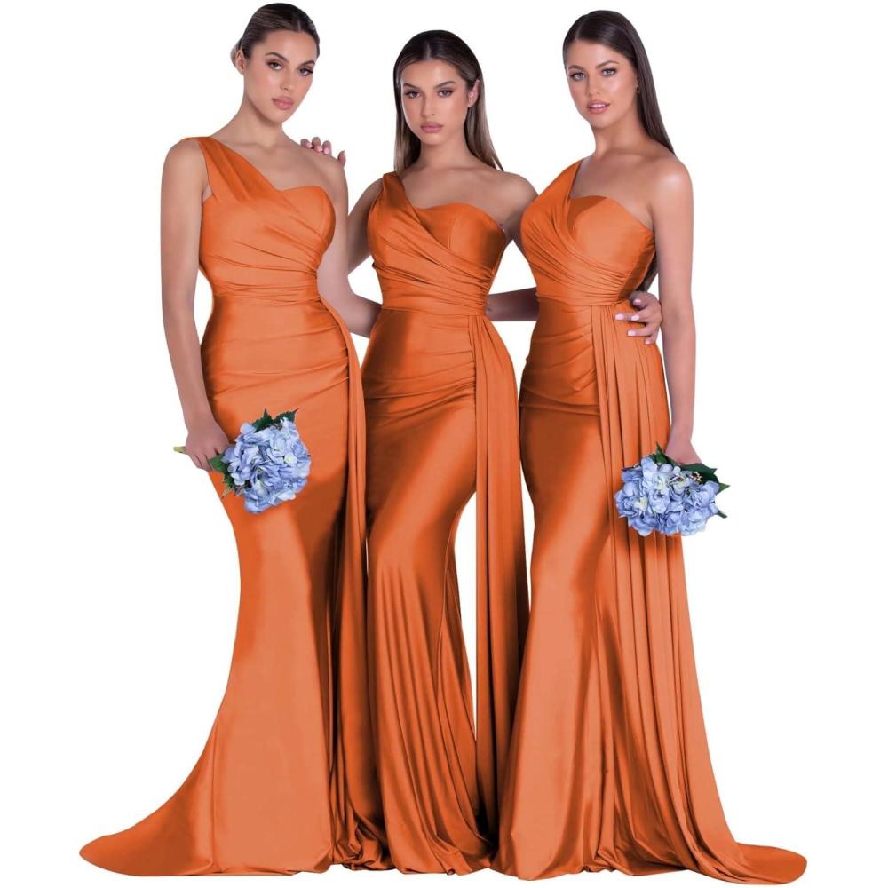 One Shoulder Mermaid Bridesmaid Dresses for Wedding Ruched Satin Prom Dress Bodycon Formal Party Dress(Orange)