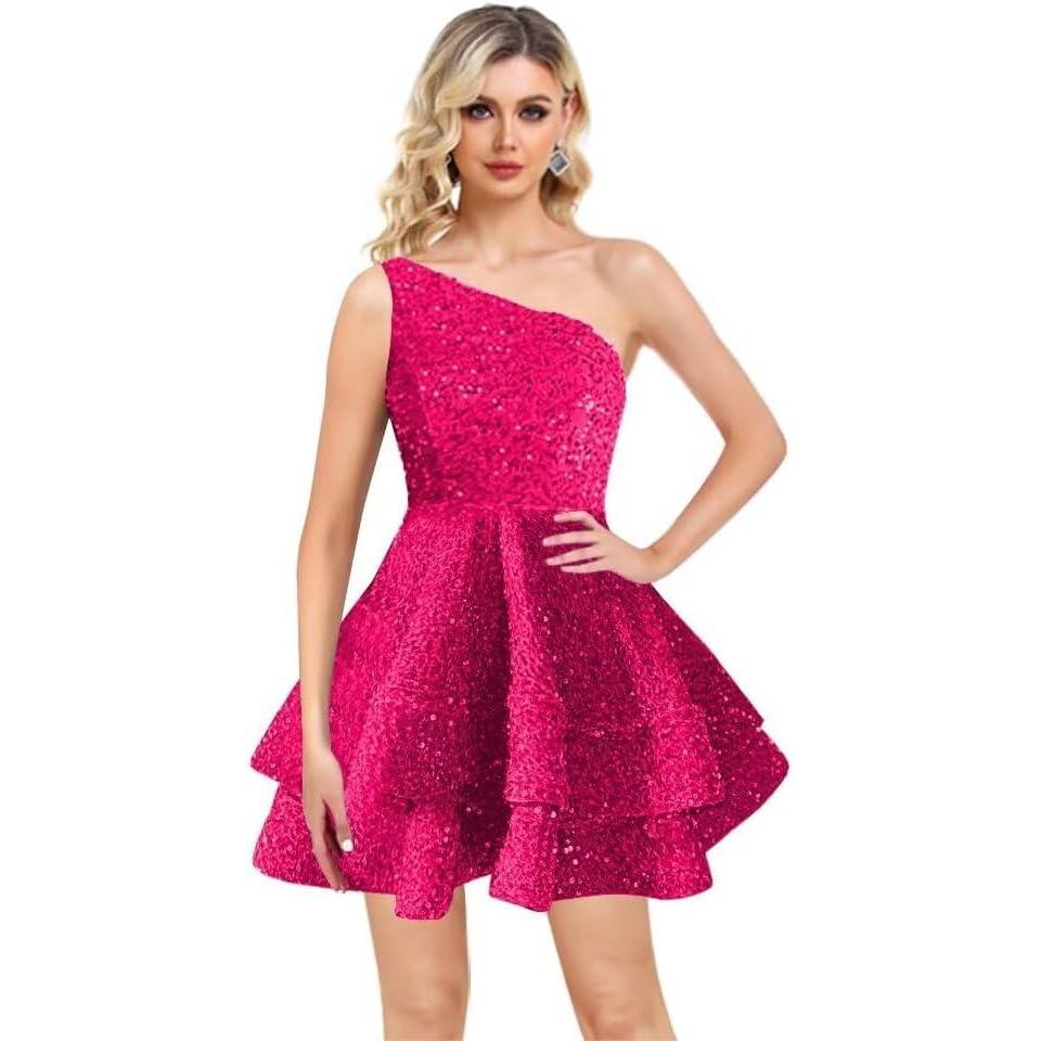 One Shoulder Sequin Homecoming Dresses Short Layered Sparkly Prom Dress for Teens 2023 A Line Evening Party Gowns(Hot Pink)