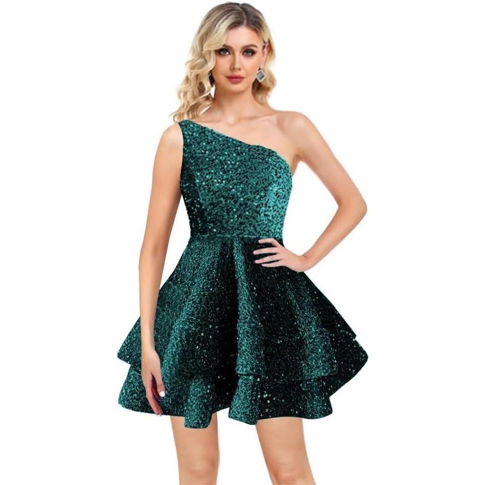 One Shoulder Sequin Homecoming Dresses Short Layered Sparkly Prom Dress for Teens 2023 A Line Evening Party Gowns(Peacock)